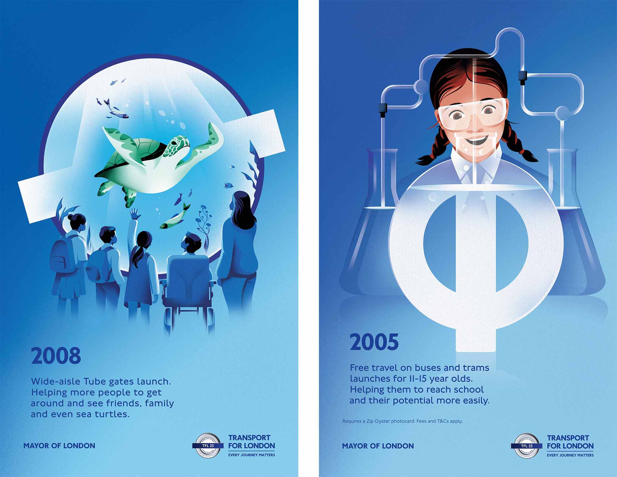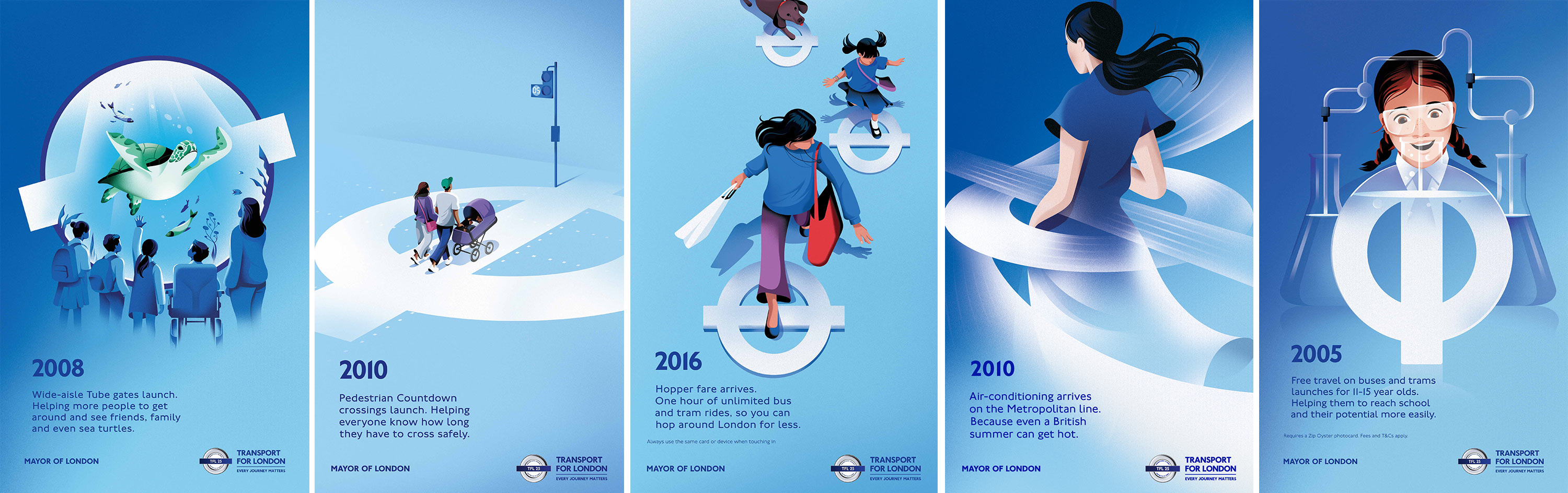Earlier in the year we shared the news that Nathalie Lees had illustrated three of the twenty five posters for the 25 years of Transport for London campaign, and now we are delighted to update that to the grand total of five. Creative agency VCCP called on Nathalie’s graphic eye and instinctive problem solving for two more of the briefs commemorating the improvements to London’s transport network over the 25 years of TfL management.